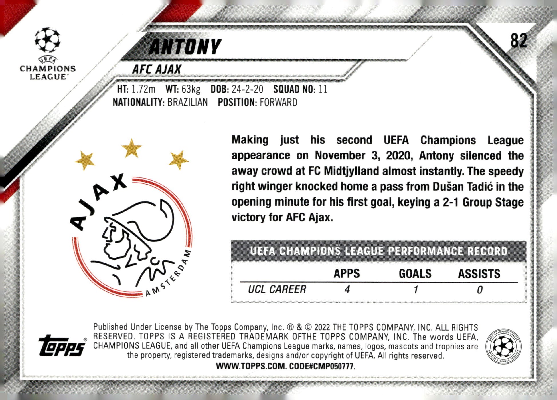 2021-22 Topps Chrome UEFA Champions League #31 Antony – AFC Ajax | Base Chrome Soccer Card
